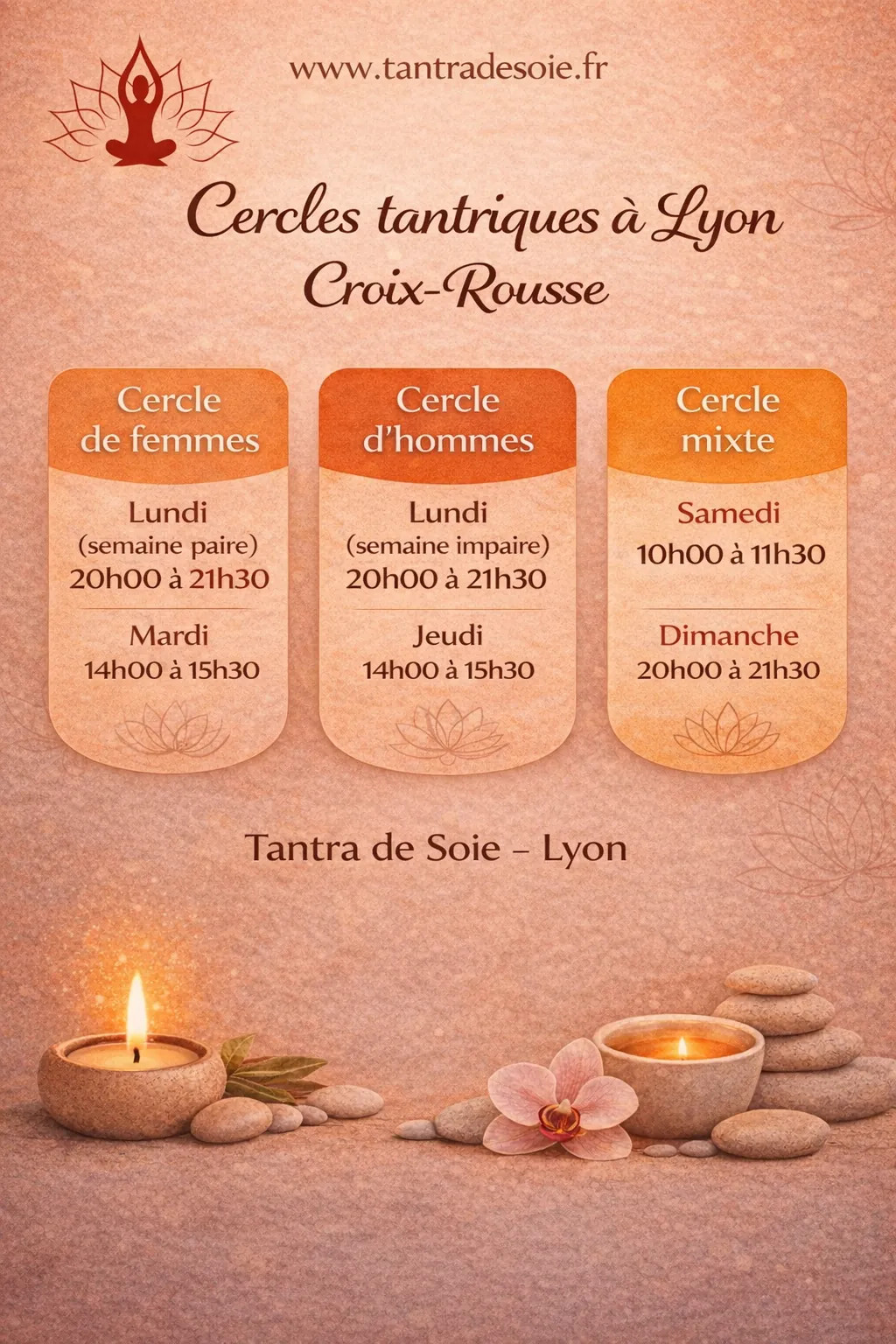 Les cercles tantriques de Tantra de Soie sont des ateliers de bien-être et de sensualité dédiés au Tantra destinés aux femmes ou aux hommes ou aux couples. Ils se déroulent sur Lyon 4 (Croix-rousse) sur une durée de 1h30 selon un programme personnalisé pour chaque atelier. Les cercles tantriques sont exclusivement animés par Chris, tantrika professionnel.